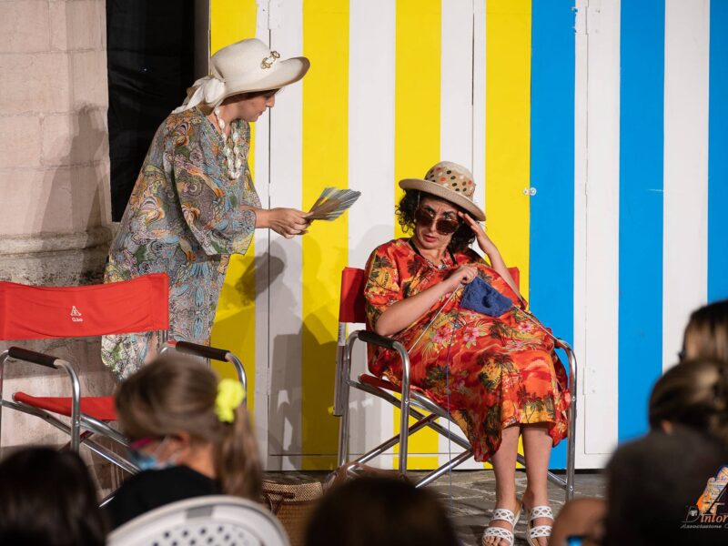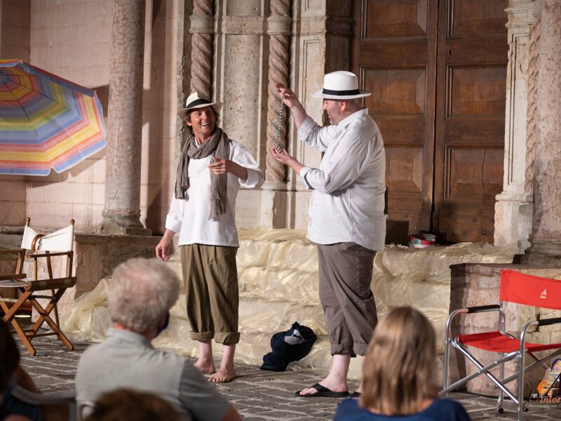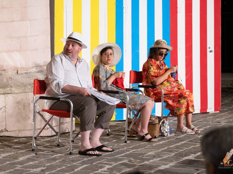 Ho assistito alla terza recita allestita nel delizioso “campiello” di San Filippo, a Nocera Umbra. Una location di sogno, quasi improvvisata, ma non per questo inadatta, anzi, contenuta in una quinta di palazzi storici con tanto di balconata aperta al suggestivo paesaggio collinare imperlato dai raggi di una falce di luna di fine agosto. Compagnia equilibrata, quella proposta da Arte e Dintorni, in tournée a Nocera dopo i successi di Gualdo e Sigillo, che dipana giochi speculari di timbri vocali e dinamiche teatrali disinvolte, ma studiate fino all’ultimo dettaglio. Bravi. Domani, chissà, un Goldoni in piena regola!