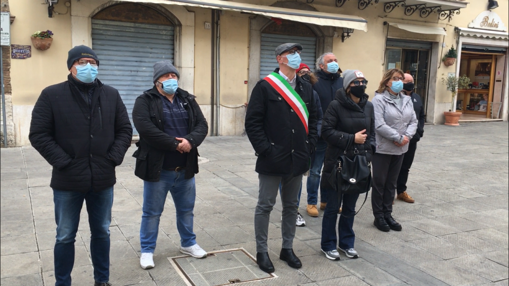 Alle ore 11 il sindaco Massimiliano Presciutti, l’intera Giunta Comunale, il Segretario Comunale Augusto Pantaleoni ed il Presidente del Consiglio Comunale Gloria Sabbatini sono scesi in Piazza Martiri per osservare un minuto di silenzio al cospetto della bandiera italiana a mezz’asta, in concomitanza dell’arrivo del presidente del Consiglio dei ministri, Mario Draghi, a Bergamo, una delle città più colpite dalla pandemia.