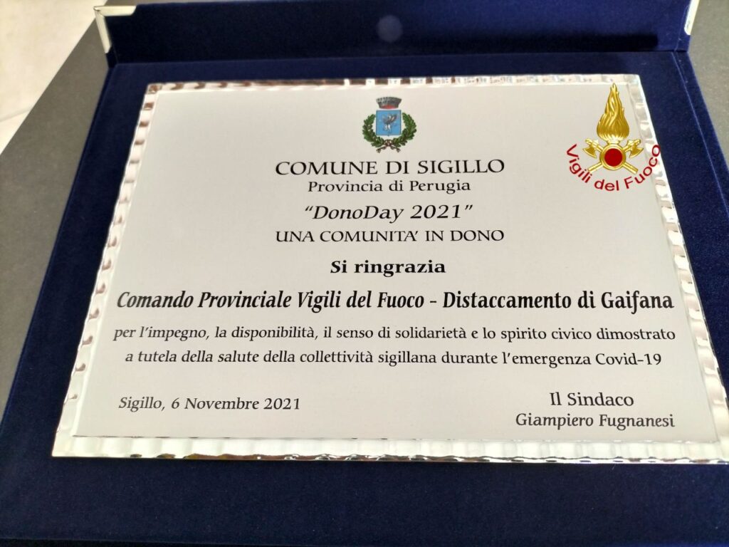 “Dono Day”, riconoscimento del Comune di Sigillo ai Vigili del Fuoco di Gaifana
