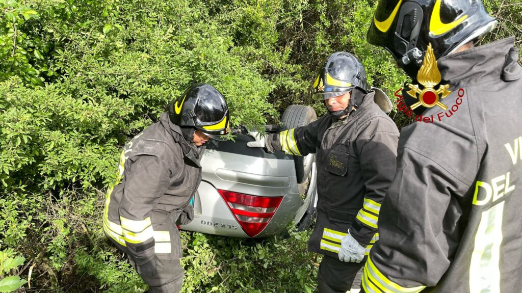 Una Mercedes, per cause in corso di accertamento, è uscita di strada ribaltandosi e finendo la sua corsa in una folta siepe di rovi.