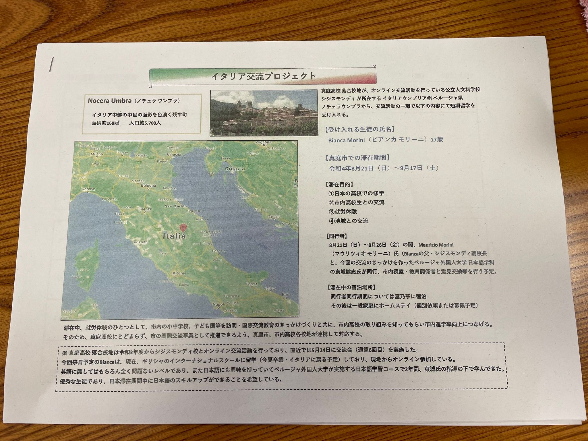La studentessa si recherà a scuola la mattina mentre nel pomeriggio svolgerà degli stage in alcune imprese del territorio; tra queste si segnalano una cantina di sakè, un complesso termale e un’azienda import-export con l’Italia. Bianca Morini è la prima studentessa liceale italiana che viene introdotta in una scuola superiore della regione giapponese e per questo motivo si è presentata con un discorso rivolto a tutti gli studenti.