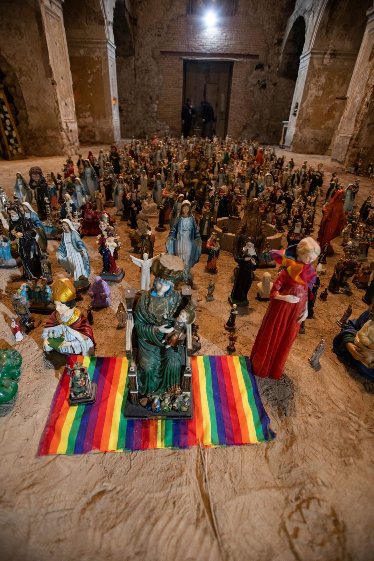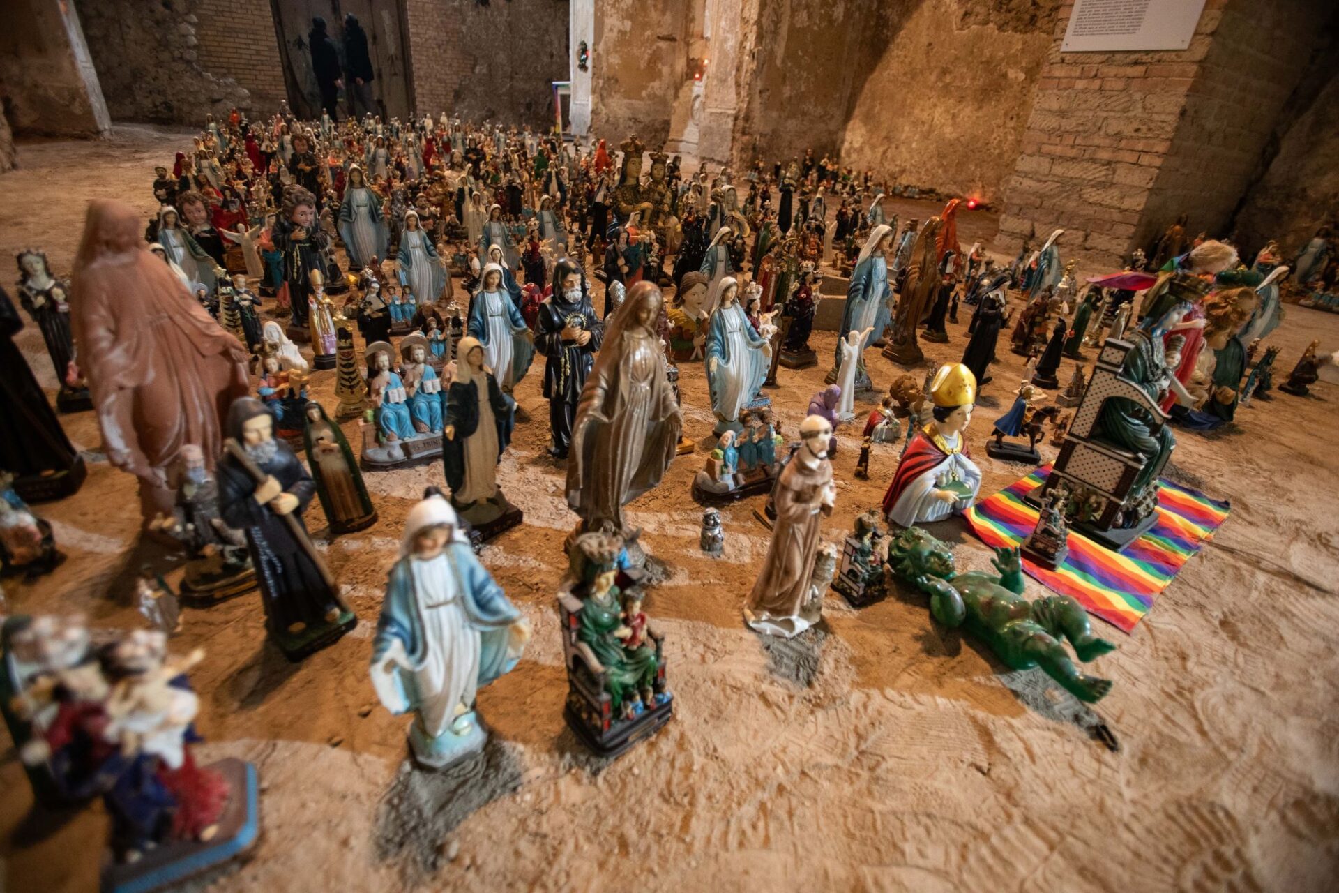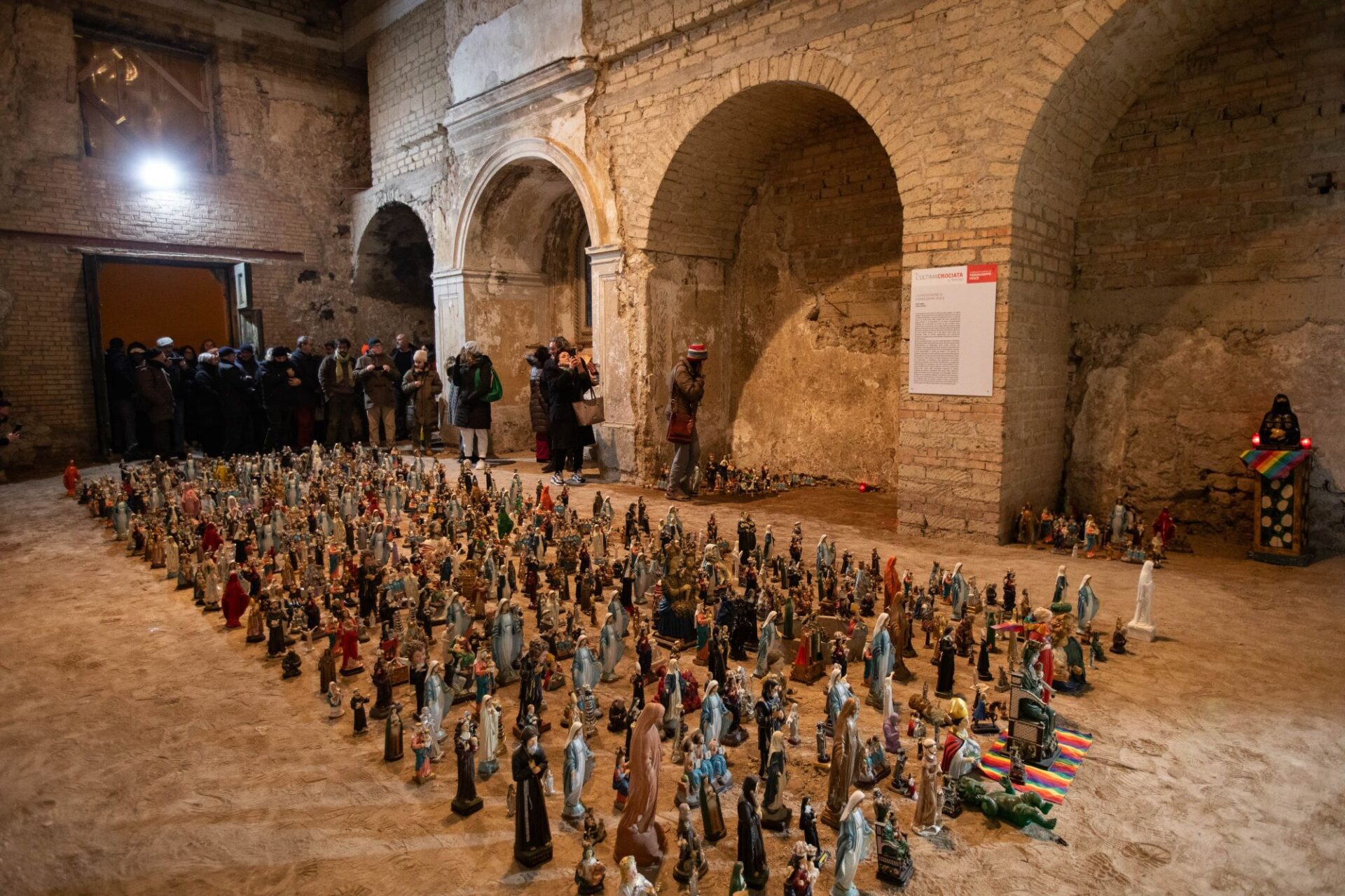 La grande macchina mistica, popolata da cinquemila statue raffiguranti santi, madonne, beati e martiri in cammino verso la redenzione, sarà presente fino al 29 febbraio nella trecentesca chiesa dell’Annunziata, da poco riaperta. Un contenitore di grande impatto, che si sposa perfettamente con l’opera.