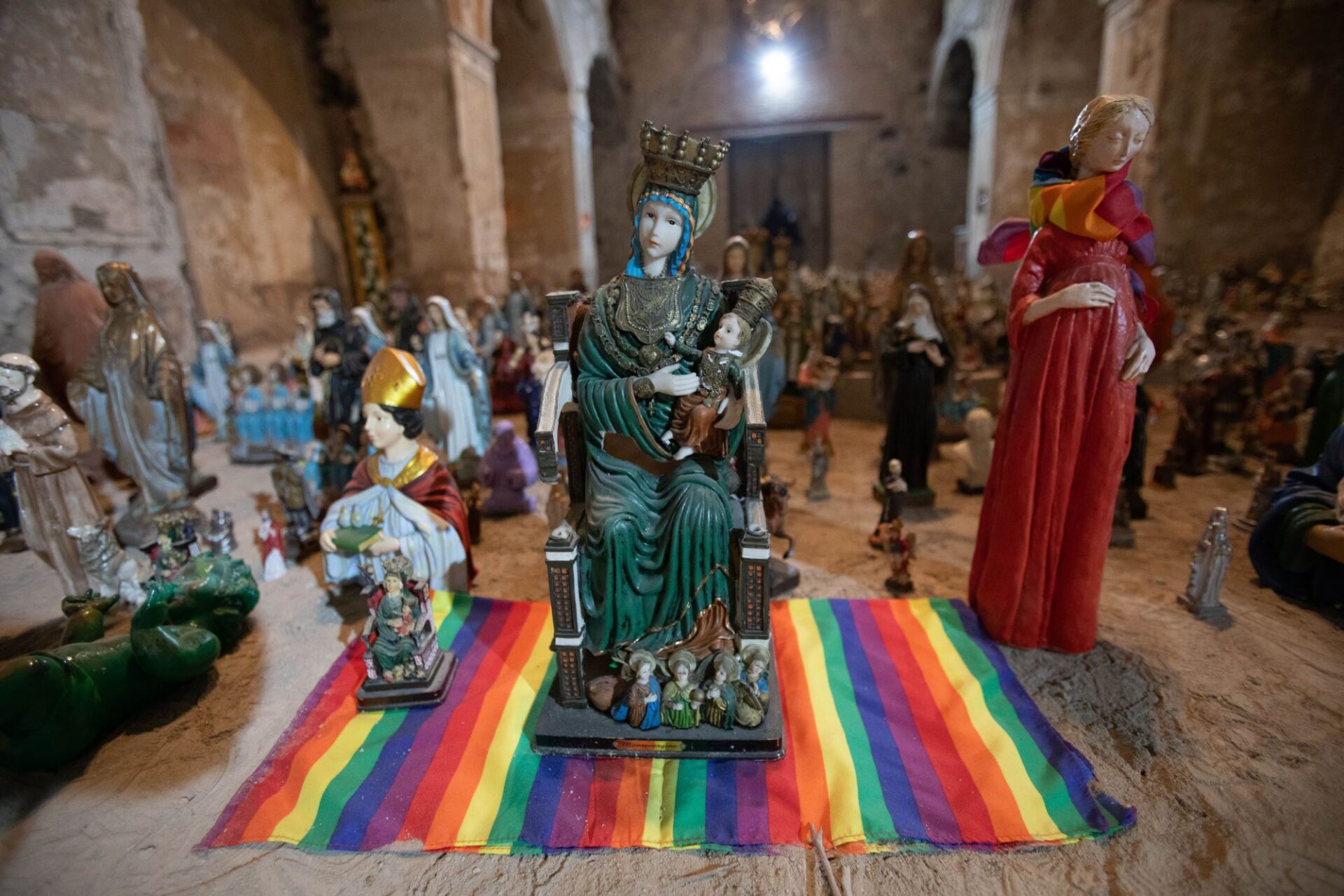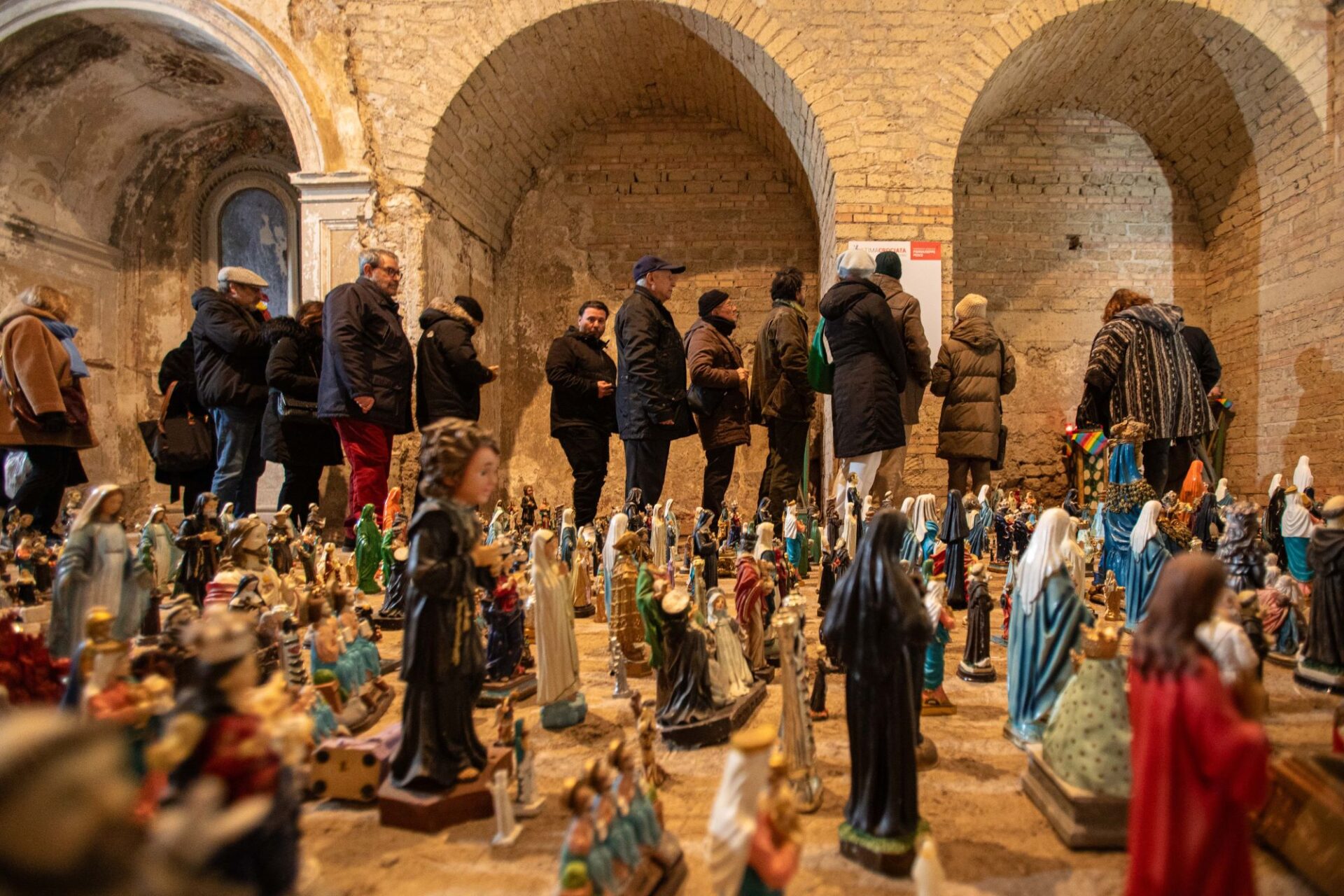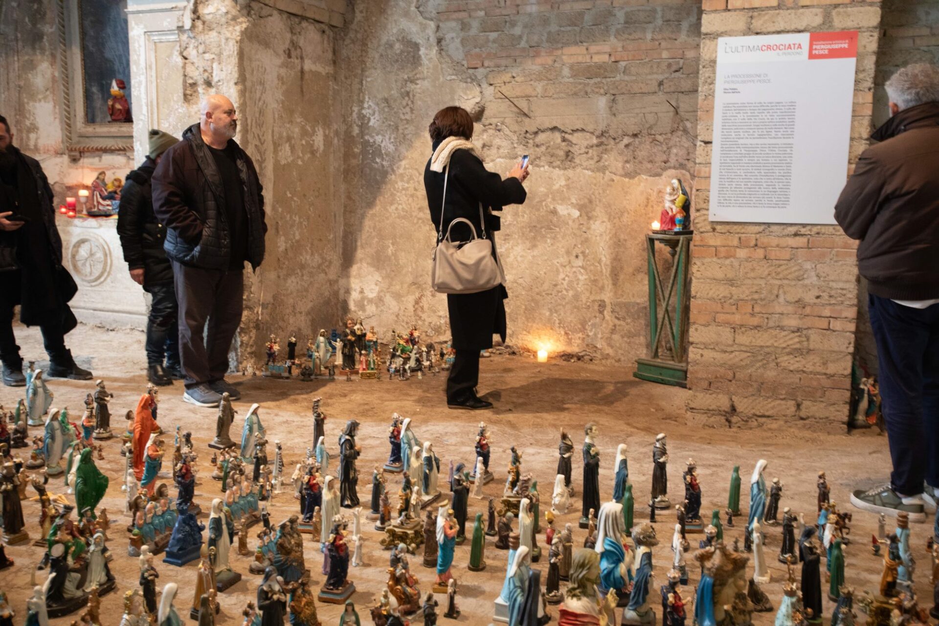 La grande macchina mistica, popolata da cinquemila statue raffiguranti santi, madonne, beati e martiri in cammino verso la redenzione, sarà presente fino al 29 febbraio nella trecentesca chiesa dell’Annunziata, da poco riaperta. Un contenitore di grande impatto, che si sposa perfettamente con l’opera.