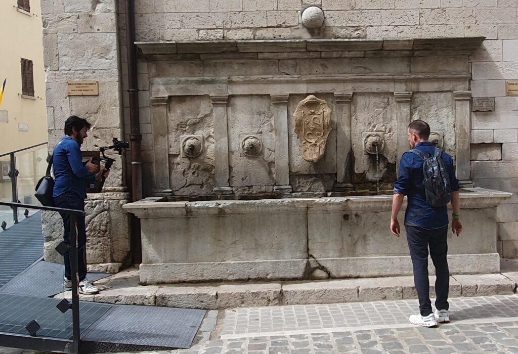 Tante le meraviglie che hanno attratto l’inviato e gli autori: la Rocca Flea, il Museo Opificio Rubboli e la storica maiolica a lustro, la Basilica Cattedrale di San Benedetto con le sacre spoglie del Beato Angelo, il dialetto, i Giochi de le Porte, le fontane, la natura rigogliosa, i caratteristici vicoli ed il simpatico “Museo del somaro. Centro per l’arte contemporanea”.