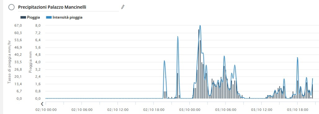 A Gualdo Tadino, l’analisi dei dati raccolti dalla stazione meteo di Palazzo Mancinelli nelle ultime 24 ore rivela che degli oltre 100 mm di pioggia, accumulati durante queste ultime 24 ore, metà sono caduti fra la mezzanotte e le tre del mattino, raggiungendo un’intensità di 67 mm/h, che in assoluto non è un rain rate elevatissimo, ma che è stato mantenuto per oltre mezz’ora, tra le 1,15 e le 1,45 del mattino.
