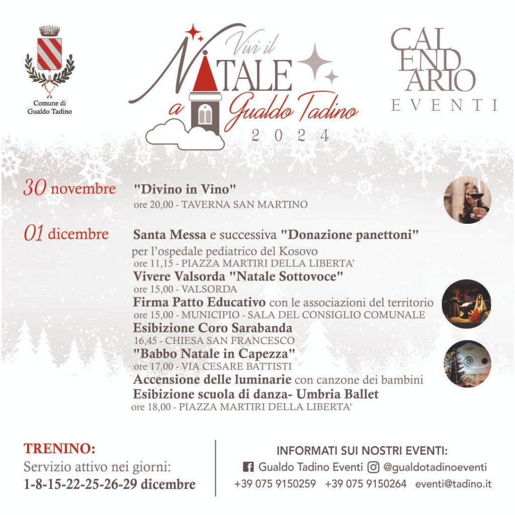 “Tante sono le iniziative organizzate dall’amministrazione comunale insieme agli esercenti attività commerciali, al Polo Museale, alle associazioni, agli istituti scolastici, al comitato Beato Angelo, alle parrocchie e ai gualdesi che hanno contribuito con idee, proposte e suggerimenti”- evidenzia l’assessore alla Cultura Gabriele Bazzucchi – Dal 30 novembre al 15 gennaio svariati eventi in città, dal centro cittadino a Valsorda passando per i quartieri e le frazioni del territorio, fruibili da famiglie, adulti e bambini, sia turisti che residenti. Giornate di serenità, piacevolezza ed intrattenimento fra sport, arte, cultura, musica, teatro, reading poetico, solidarietà e beneficenza per passare tutti insieme le festività natalizie, l’Epifania ed i festeggiamenti del nostro patrono Beato Angelo.”