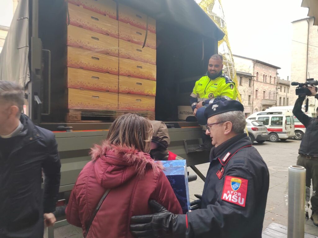 A seguire, in piazza Martiri della Libertà, ha avuto luogo la consegna dei panettoni, che sono stati caricati su un camion militare, appartenente al Reggimento Carabinieri MSU, e partiranno nei prossimi giorni verso il Kosovo, portando con sé il calore e la generosità della comunità gualdese.