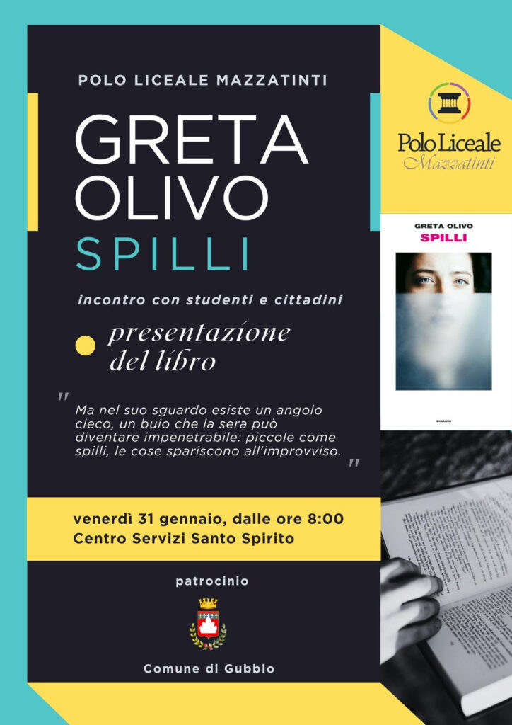 Venerdì 31 Gennaio 2025 il Caffè Letterario del Polo Liceale Mazzatinti, con il patrocinio del Comune di Gubbio, ospiterà presso il Centro Servizi Santo Spirito la scrittrice emergente Greta Olivo, autrice del romanzo Spilli edito da Einaudi.