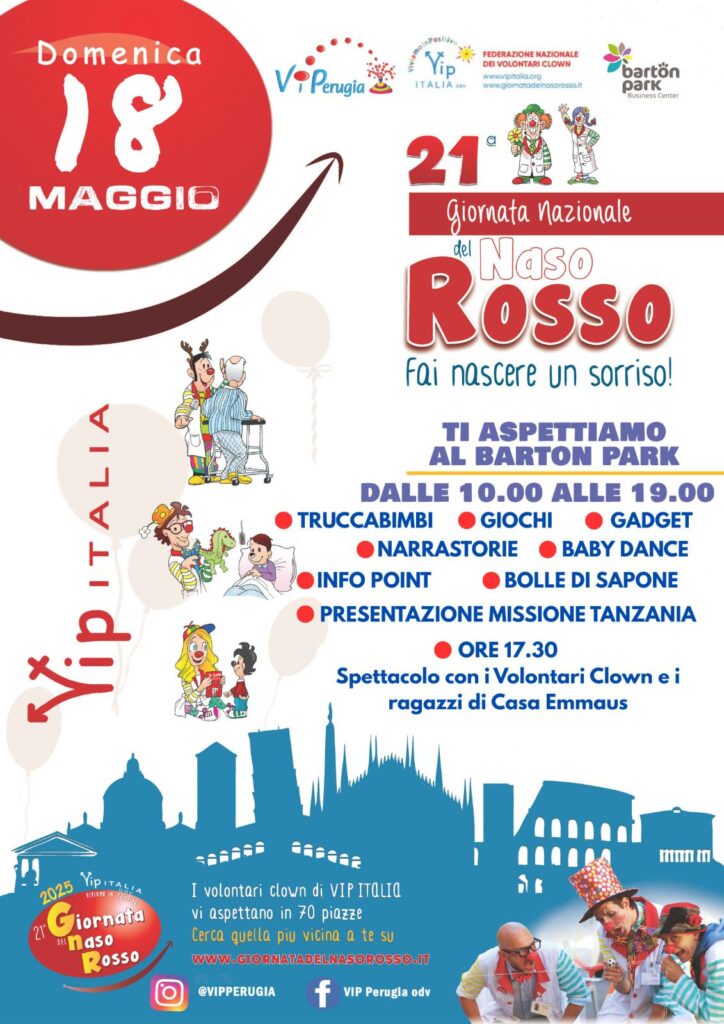 Domenica 18 maggio al Barton Park di Perugia torna la Giornata del Naso Rosso, la grande festa dei volontari clown di VIP Perugia Odv, associazione federata in ViviamoInPositivo – VipItalia ODV (www.clownterapia.it), la più grande organizzazione di clownterapia d’Italia che vede la partecipazione di 71 associazioni e circa 4700 volontari clown in varie città italiane.