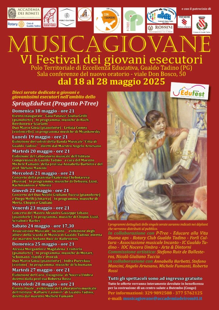 Sta per iniziare la sesta edizione di “MusicaGiovane”, la rassegna musicale dell’Accademia dei Romiti dedicata ai giovani e giovanissimi musicisti. Il via domenica 18 maggio alle ore 21 presso l’auditorium del nuovo oratorio “Don Bosco” di Gualdo Tadino. Come lo scorso anno la rassegna è compresa all’interno degli eventi della seconda edizione dello Spring edu-Fest, il festival dell’educazione dei giovani della fascia appenninica, realizzato nell’ambito del progetto “P-Tree”, finanziato dall’Impresa sociale “Con i Bambini”, in collaborazione con il Rotary Club di Gualdo Tadino e Nocera Umbra.