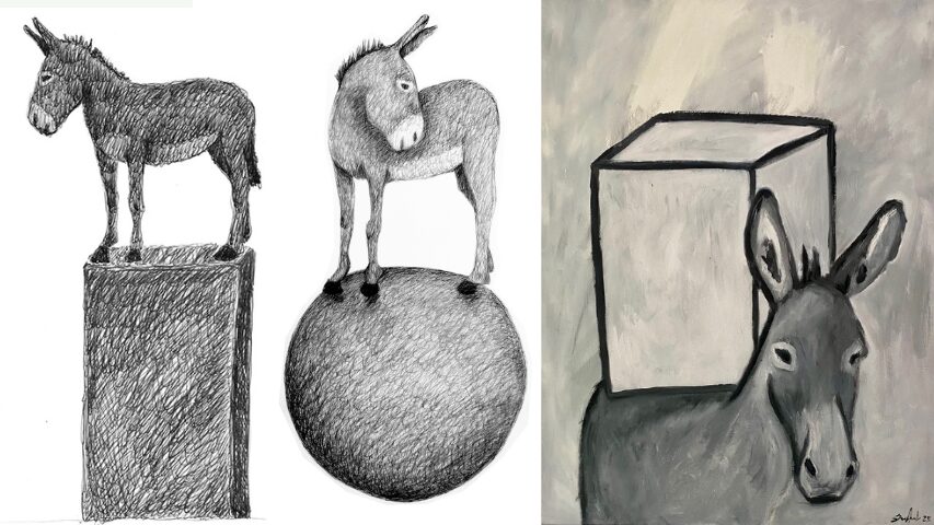 C’è nei lavori esposti un sentire intimo e umile e le opere dell’artista toscano si incentrano proprio sull’umiltà del somaro, in cerca di un riscatto per il suo essere considerato ingiustamente sinonimo di incapacità, accostato —come scrive Valeria Bruni— al priapismo in maniera derisoria, una sorta di antitesi del cavallo, fiero e indomito animale dei guerrieri e dei potenti, e allora ecco che essere un somaro diventa una virtù e lui fiero e consapevole “sale” su un piedistallo e si staglia orgoglioso nel cielo.