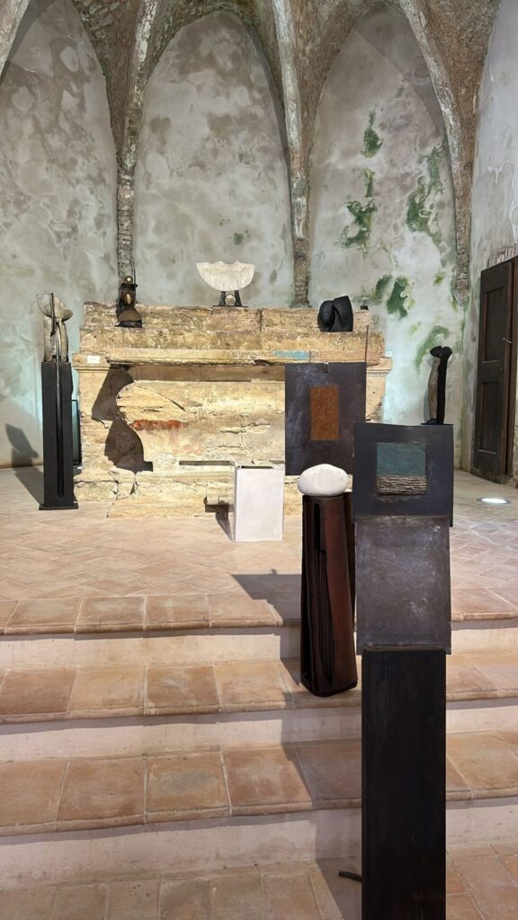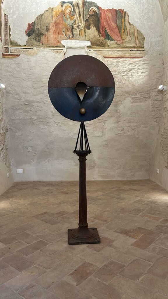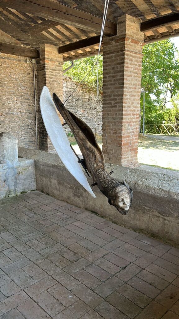 Le materie che Boldrini manipola – la pietra, il legno, il ferro, la ceramica – non sono scelte casuali. Esse risuonano con la storia stessa di questo luogo. Le sue sculture non sono meri manufatti, ma frammenti di un paesaggio interiore ed esteriore, che raccontano del Monte Cucco, persino il cielo plumbeo attraversato dai corvi, come evocato nella brochure della mostra.