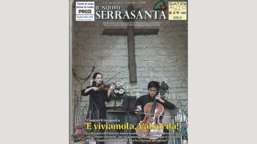 E’ dedicata al concerto di Gaia Trionfera e Nigel Thean, organizzato dall’associazione Vivere Valsorda nella chiesetta delle pinetina adiacente al rifugio omonimo, la copertina del numero di agosto de Il Nuovo Serrasanta.
