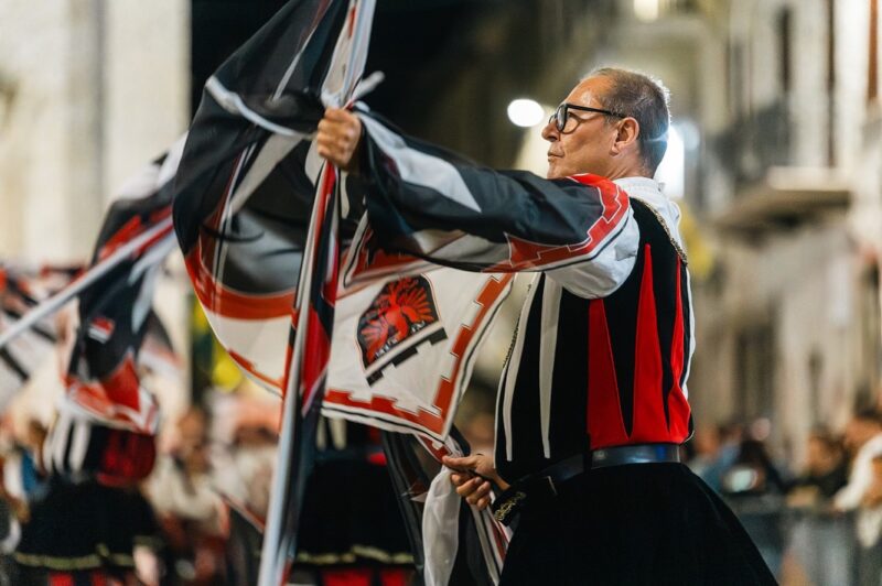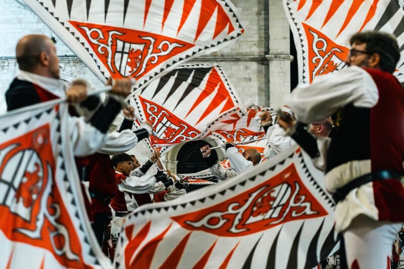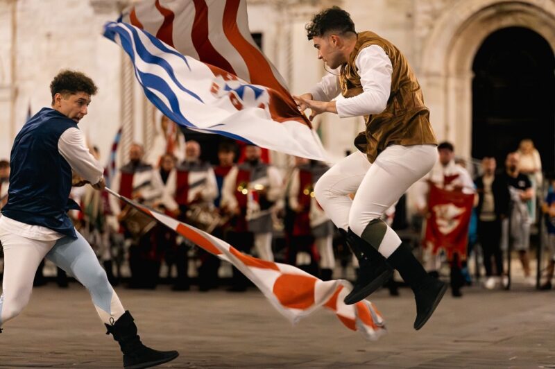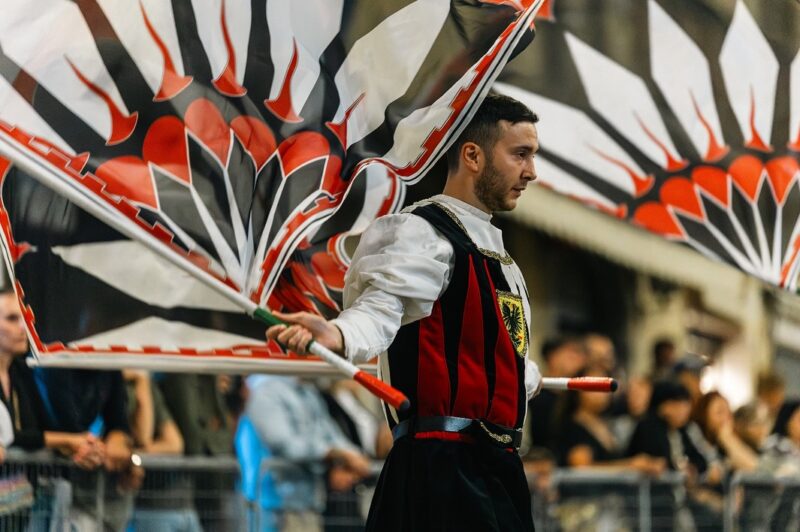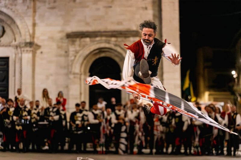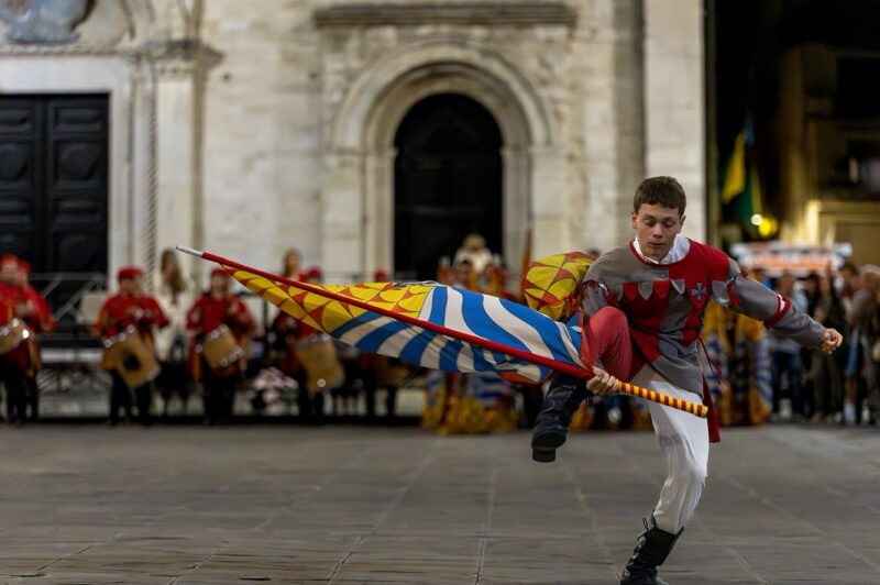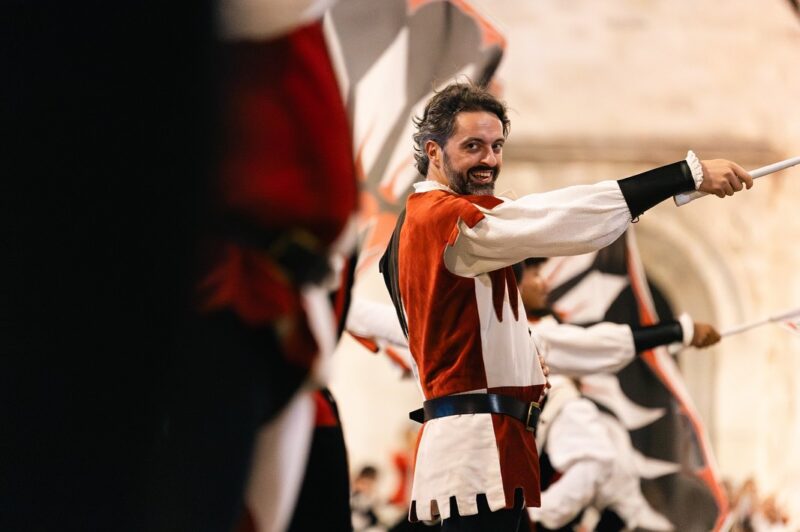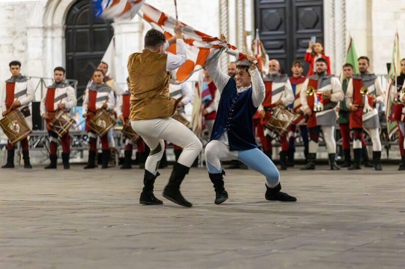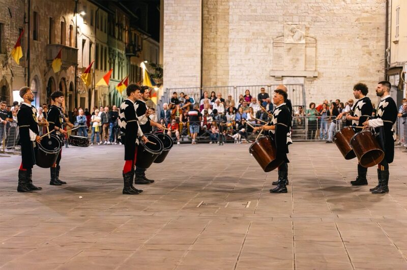 A rendere omaggio al Gruppo Sbandieratori di Gualdo Tadino i colleghi di Assisi, Fermo e Calvi dell’Umbria che hanno dato vita a esibizioni spettacolari, incantando il pubblico con coreografie mozzafiato e giochi di bandiere accompagnati dal ritmo coinvolgente dei tamburi.
