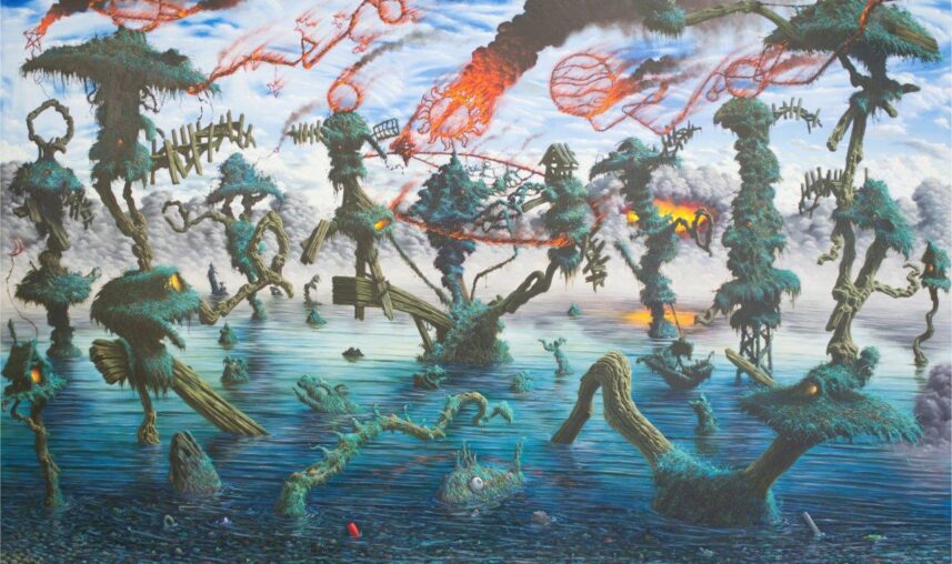 Fulvio Di Piazza (Siracusa, 1969): utilizza un linguaggio pittorico visionario per indagare le relazioni tra mondo animale e vegetale attraverso immagini organiche e metamorfiche. Le sue creature ibride popolano paesaggi surreali, richiamando atmosfere barocche e fantascientifiche, esprimendo un animismo ancestrale e un senso tragico radicato nella cultura siciliana.