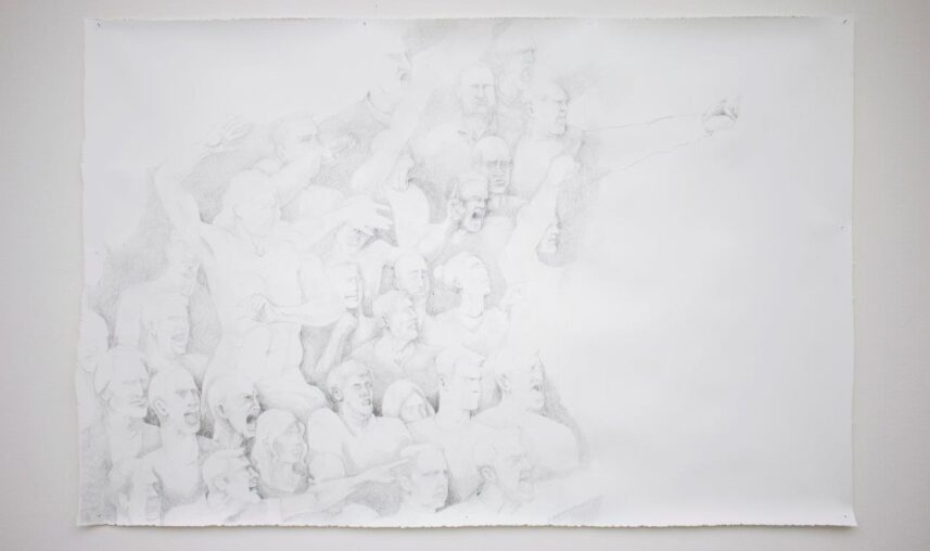 Ruth Beraha (Milano, 1986): artista multidisciplinare che, nella serie di disegni Love me tender, esplora la perdita dell’individualità nelle masse aggressive. I suoi ritratti maschili, nebulosi e sospesi tra aggressività e vulnerabilità, criticano i miti del patriarcato e le connessioni tra fede e violenza in contesti politici e religiosi.