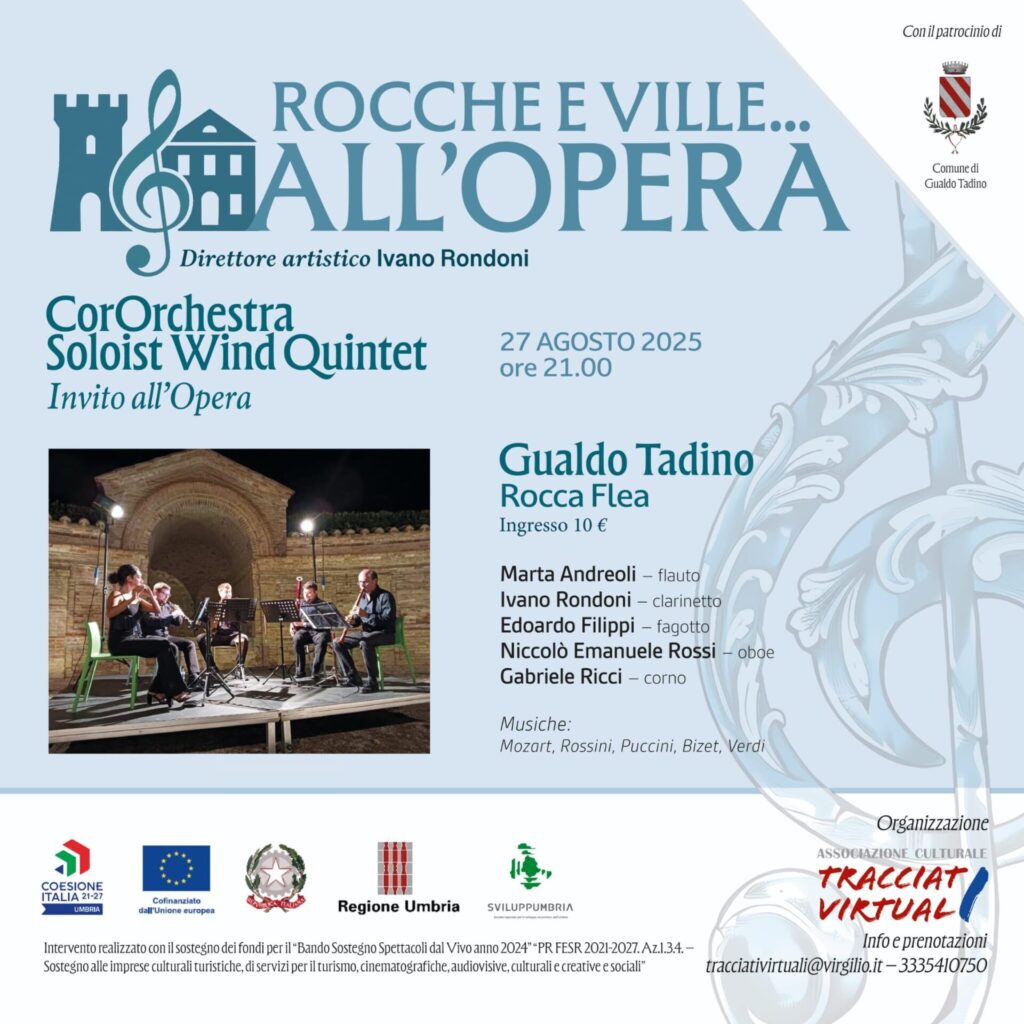 Alla Rocca Flea concerto del CorOrchestra Soloist Wind Quintet, composto da musicisti di grande talento: Niccolò E. Rossi – oboe, Marta Andreoli – flauto, Ivano Rondoni – clarinetto, Gabriele Ricci – corno, Edoardo Filippi – fagotto, che eseguirà un repertorio di ouverture tratte dalle più belle pagine operistiche di Mozart, Rossini, Puccini, Bizet e Verdi.