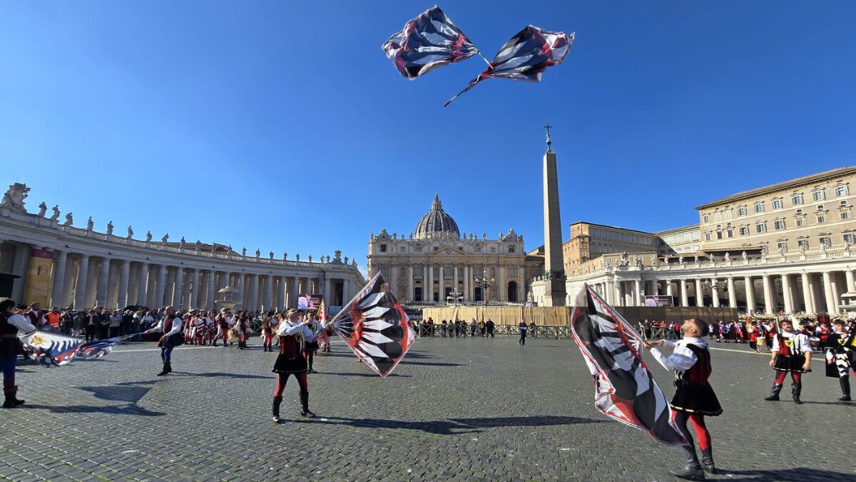 Quindi gli sbandieratori di Gualdo Tadino, guidati dal capitano Luca Centini, si sono esibiti insieme nella spettacolare cornice di Piazza San Pietro. Un’occasione particolarmente significativa per il gruppo, che ha potuto far roteare le proprie bandiere in una delle piazze più prestigiose e simboliche del mondo.