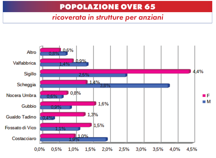 I comuni con la maggiore incidenza di popolazione anziana sono Costacciaro (35,1%) e Scheggia e Pascelupo (33,5%), seguiti da Sigillo (32%). Gubbio e Fossato di Vico risultano i più “giovani” con il 28%. La fascia degli “anziani” (75-89 anni) è la più numerosa, superiore del 4% rispetto ai “giovani anziani” (65-74 anni). I “grandi anziani” over 90 rappresentano il 7,7% del totale.