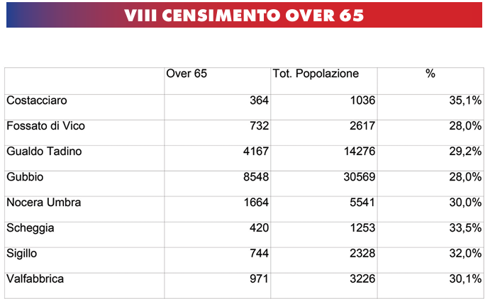 Negli otto comuni coinvolti nella rilevazione (Gubbio, Gualdo Tadino, Nocera Umbra, Valfabbrica, Fossato di Vico, Sigillo, Costacciaro e Scheggia e Pascelupo) gli over 65 sono 17.610 su una popolazione totale di 60.846 abitanti: il 28,9%, contro il 24,7% della media italiana rilevata dall’Istat al 1° maggio 2025. Un dato che supera anche quello umbro, fermo al 27,3% al 1° gennaio 2025.