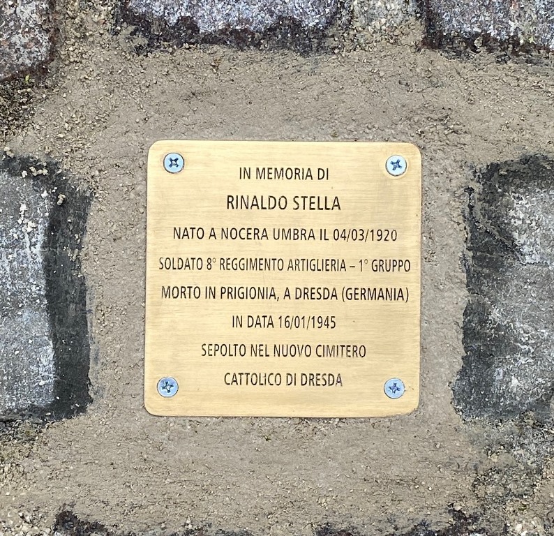 Rinaldo Stella, nato da Nicolò e Adele Pompei, il 4 marzo 1920 a Nocera Umbra, soldato appartenente all’8° Reggimento artiglieria 1′ Gruppo, morì in prigionia a Dresda (Germania) il 16 gennaio 1945 e sepolto nel nuovo cimitero cattolico di Dresda.