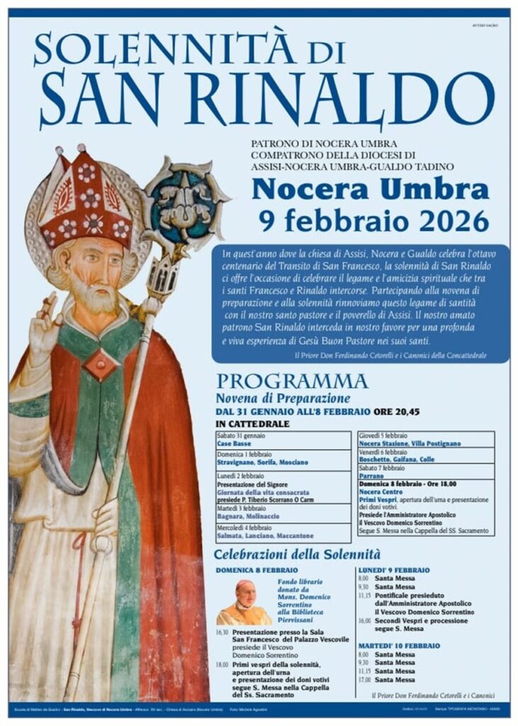 Nocera Umbra si avvicina alla solennità di San Rinaldo, patrono della città e compatrono della Diocesi di Assisi–Nocera Umbra–Gualdo Tadino, che sarà celebrata lunedì 9 febbraio.