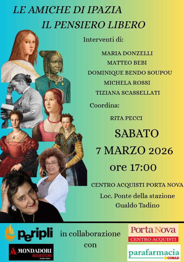 Il pensiero libero non è solo un titolo, ma anche un invito. Sabato 7 marzo 2026 alle ore 17, arriva un nuovo appuntamento culturale presso il centro commerciale Porta Nova di Gualdo Tadino con “Le amiche di Ipazia – Il pensiero libero”, un pomeriggio dedicato alla riflessione e al confronto, arricchito da interventi prestigiosi che esploreranno le diverse sfumature della libertà di pensiero.