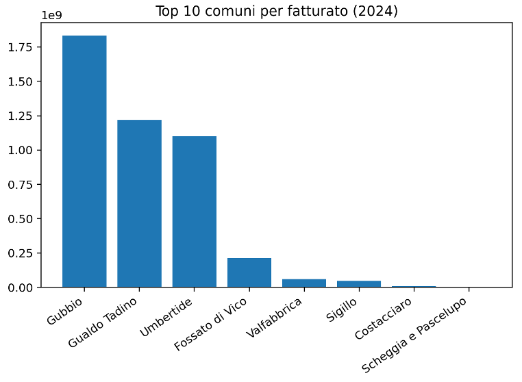 Nel dettaglio comunale, Gubbio guida la classifica per dimensione e qualità della performance: 1.836.000 euro circa di fatturato, con EBITDA% 16,28% e utile% 10,43%, evidenziando un profilo industriale capace di trasformare ricavi in margine e risultato.