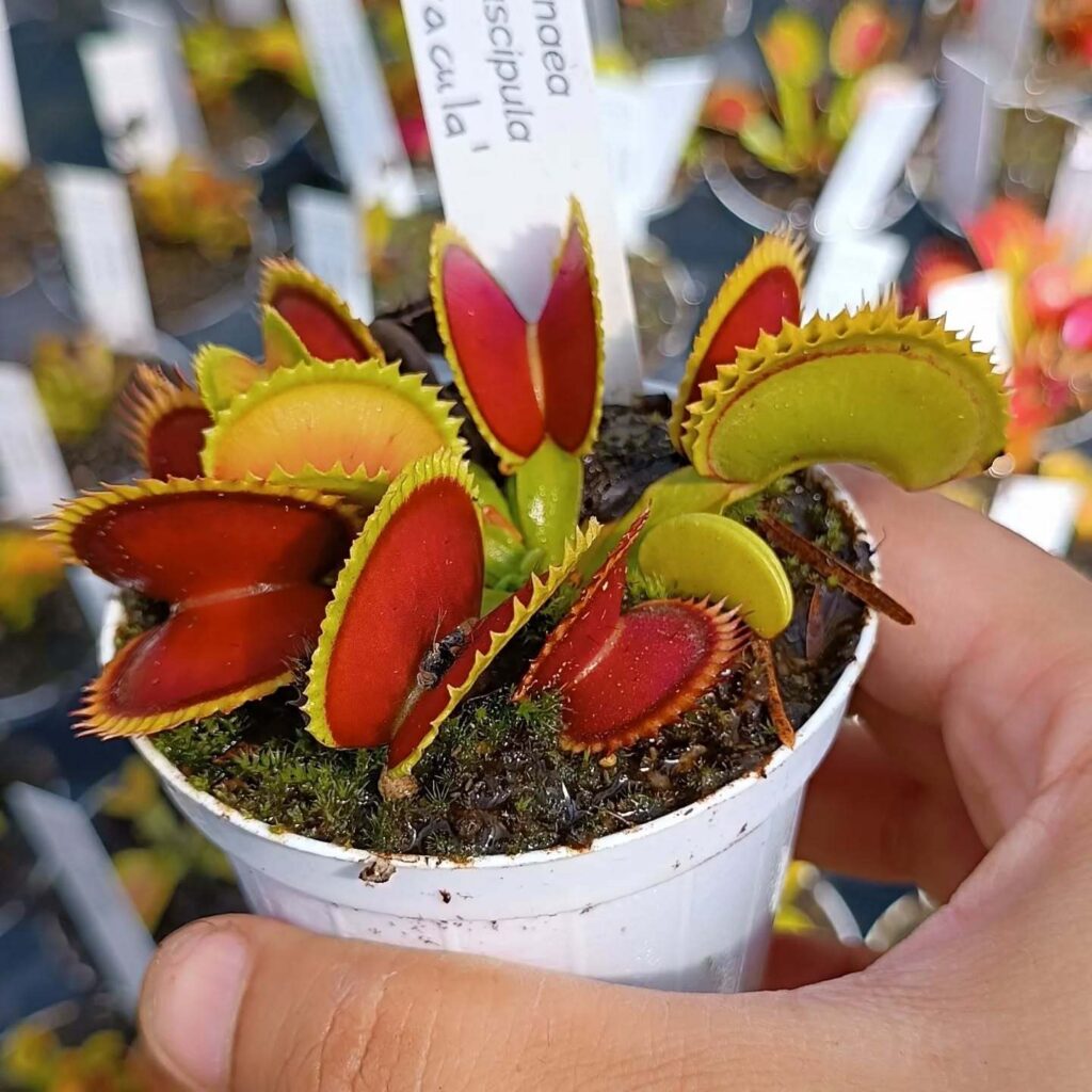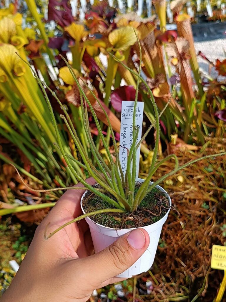 Tra le rarità disponibili spiccano la Brocchinia reducta, bromeliacea carnivora parente dell’ananas, la Nepenthes x “Gaya” con le sue trappole ricadenti a forma di brocca leopardata, la Dionaea muscipula “EG scaly dragon” con le sue caratteristiche squame, e e la maestosa Sarracenia x “EG Esotik Guardian” con trappole alte oltre un metro.