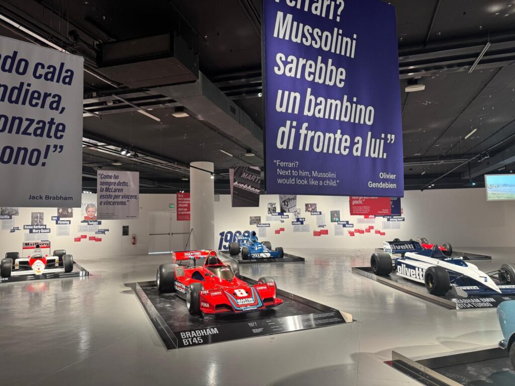 Il percorso espositivo copre tre decenni, dalla Cooper T51 del 1958 fino alla Brabham BMW BT54 dell’era turbo, passando per la Lotus 72, la Tyrrell P34 a sei ruote e la McLaren MP4/5.