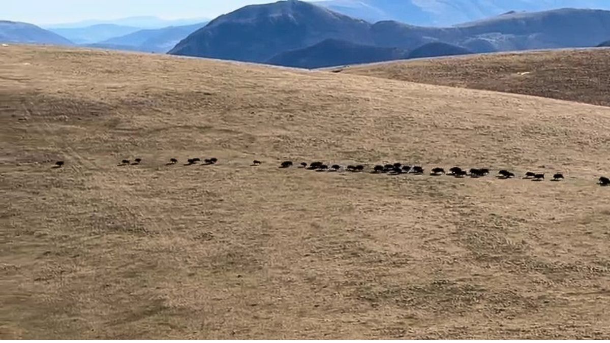 Una scena che ha colpito per dimensioni e modalità: gli animali sono stati osservati mentre si spostavano in fila di corsa lungo un crinale, in un comportamento che ricorda quello di una vera e propria mandria in movimento.